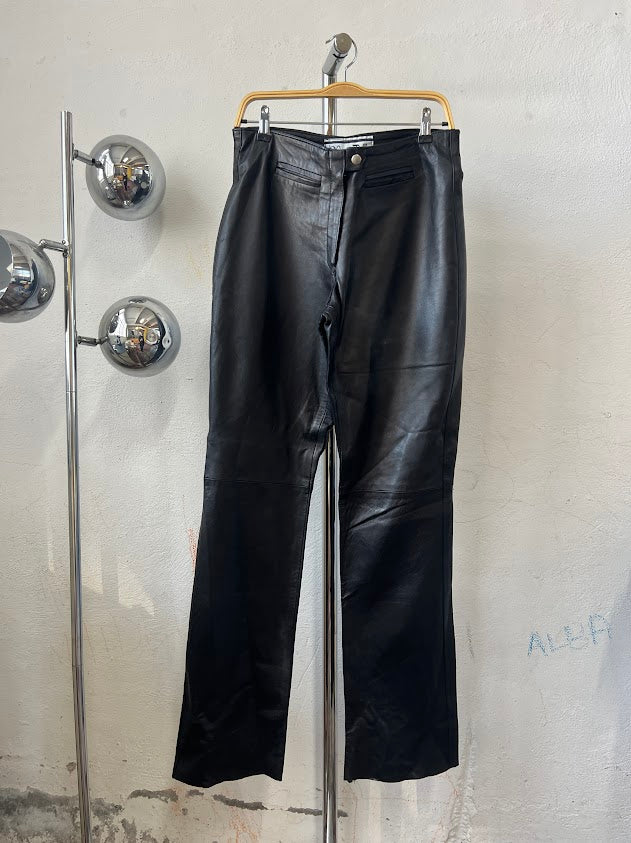 Pantalón de cuero auténtico, fabricado en Italia. Corte recto, tiro medio/alto, con cierre delantero de cremallera y botón. Etiqueta de talla 46 (equivale aprox. a una 42 EU).