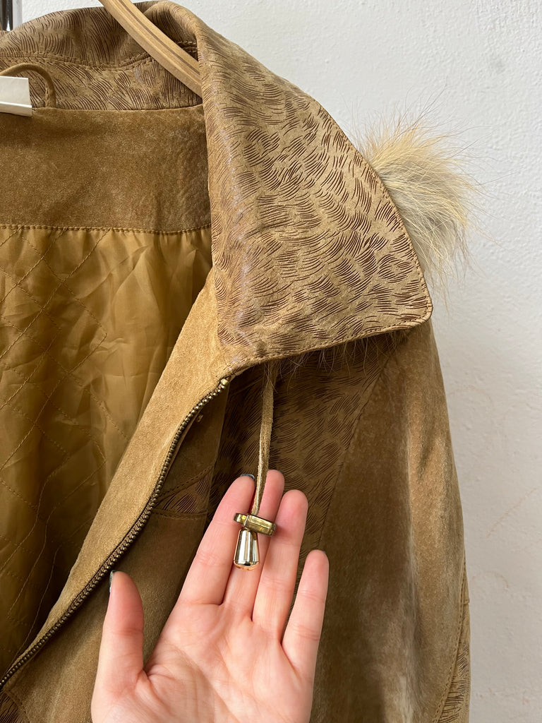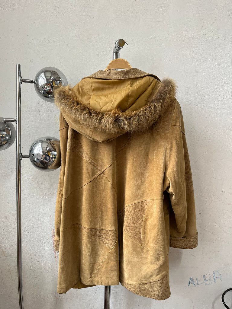 Abrigo largo de ante patchwork con capucha y detalles de pelo sintético en el borde.