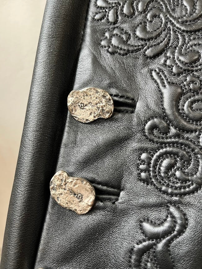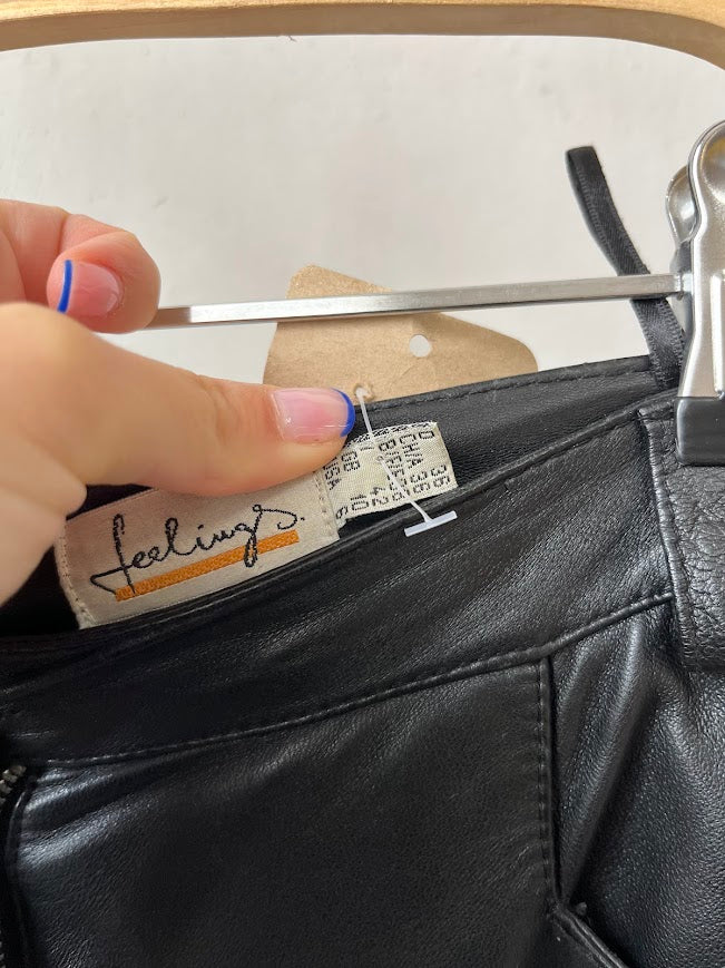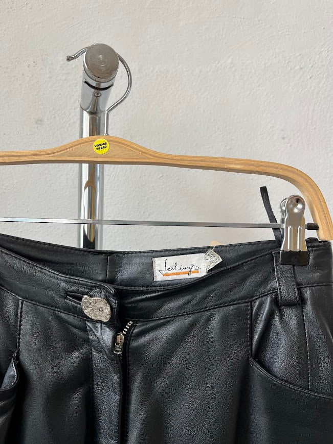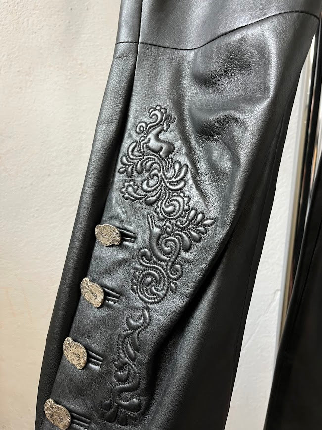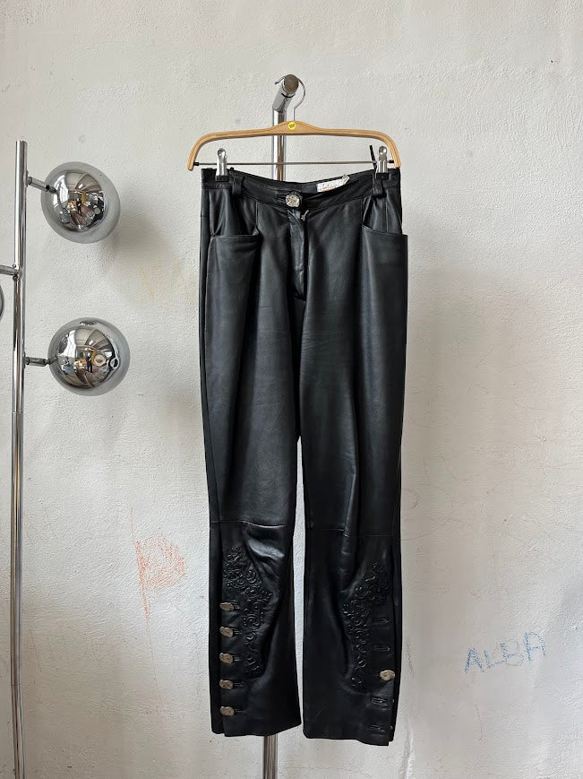 Pantalón de piel sintética negra con detalles bordados en la parte baja de las piernas.