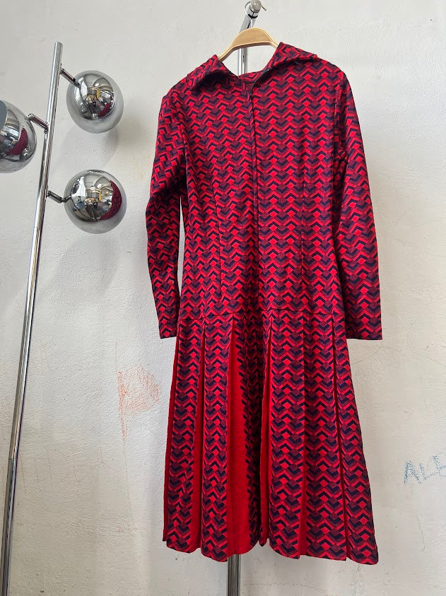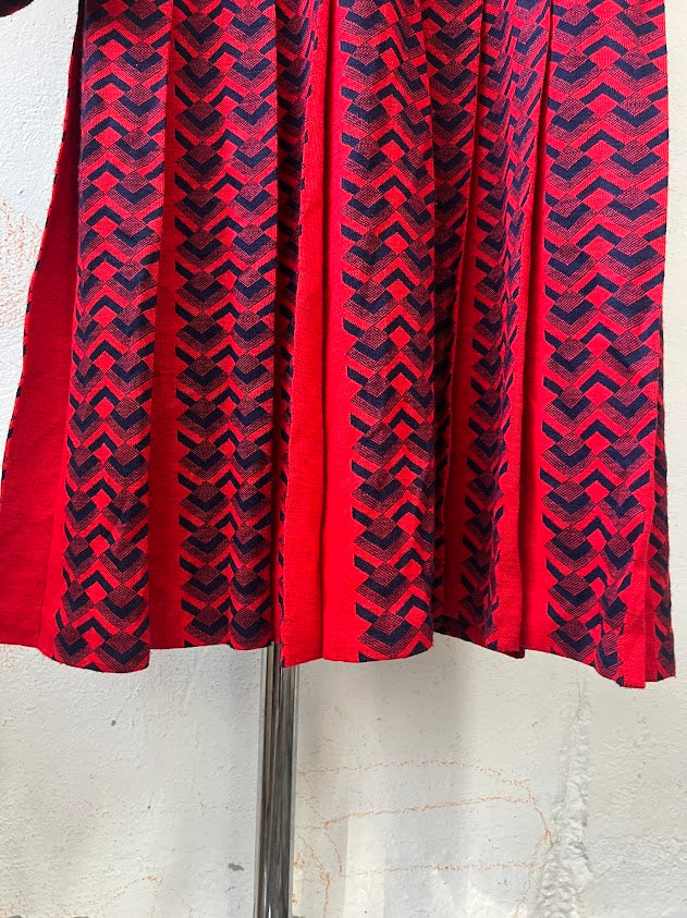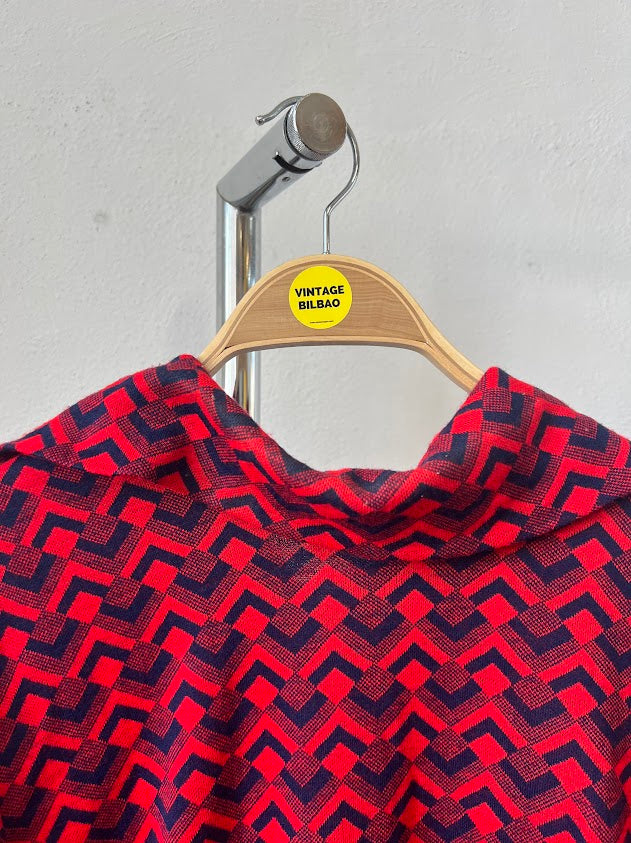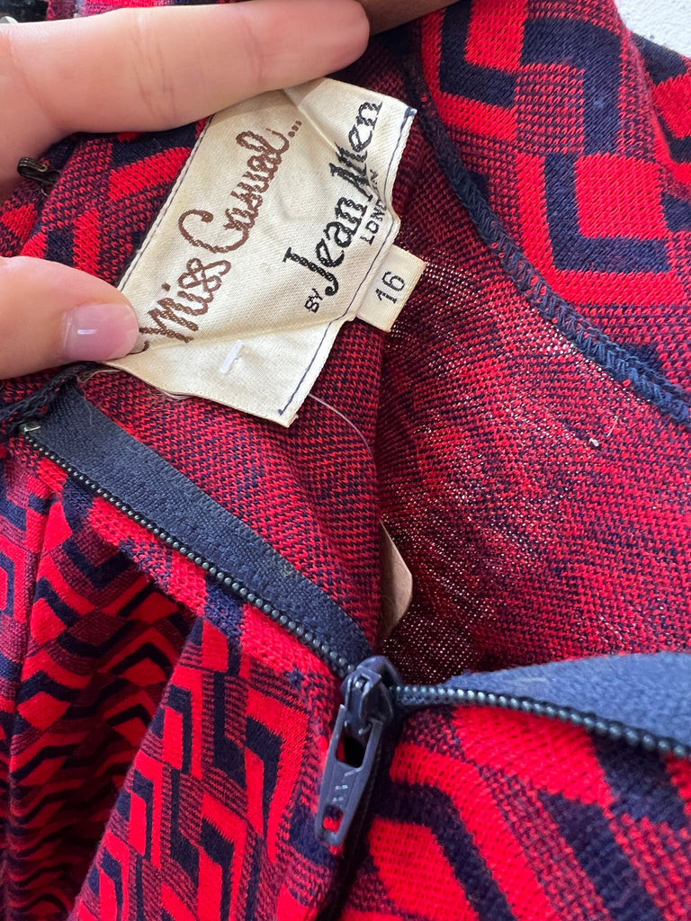 Vestido midi de los años 60/70 con estampado geométrico en rojo y azul marino. Corte elegante con falda ligeramente acampanada, manga larga y cuello tipo chimenea. Cierre con cremallera trasera. Talla 16 UK (aprox. 44 EU).
