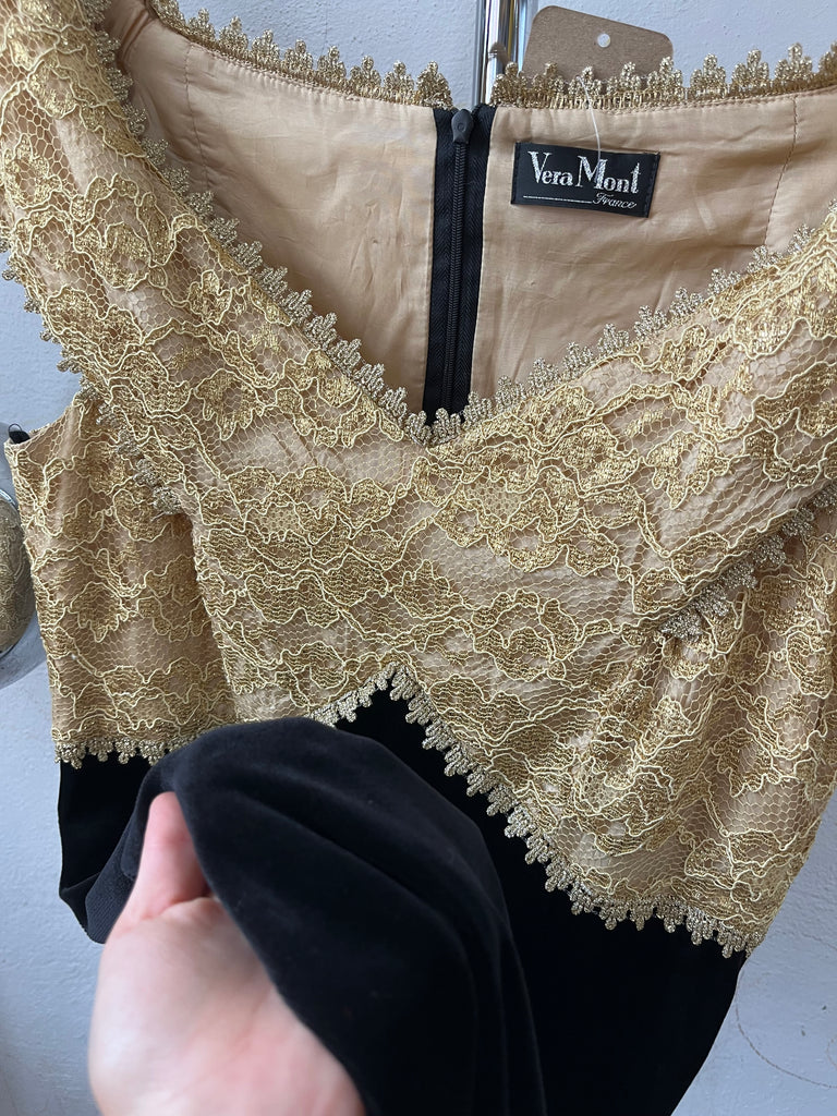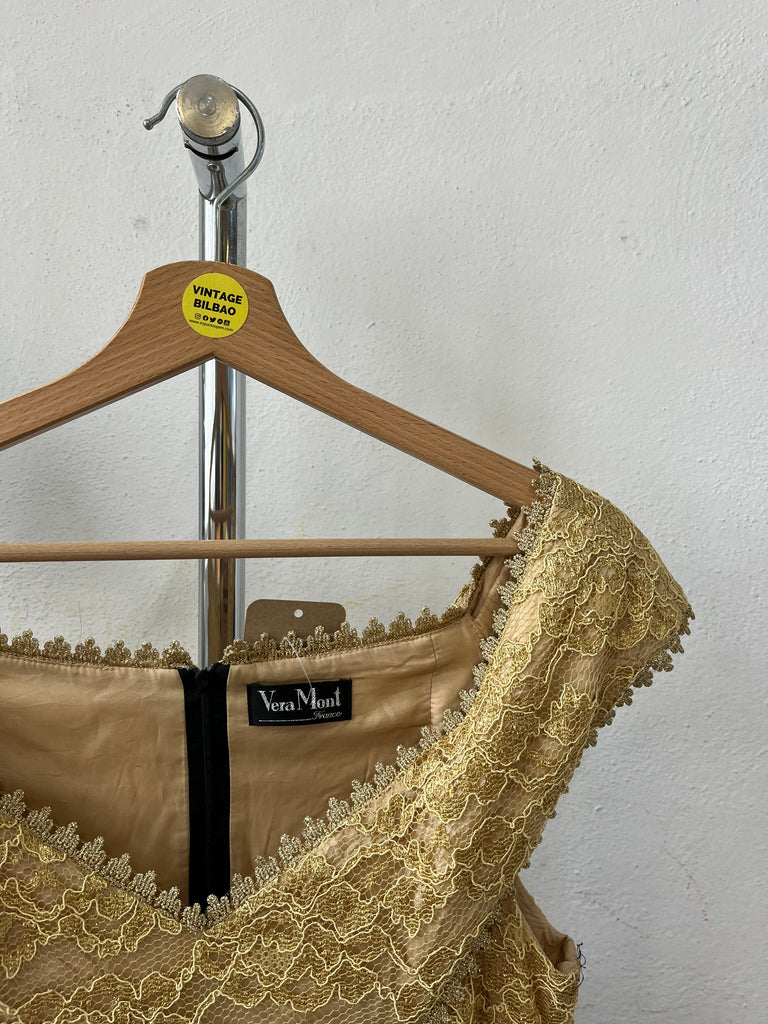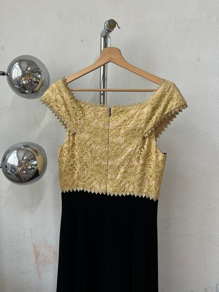 • Color: parte superior en encaje dorado con forro beige, falda de terciopelo negro.